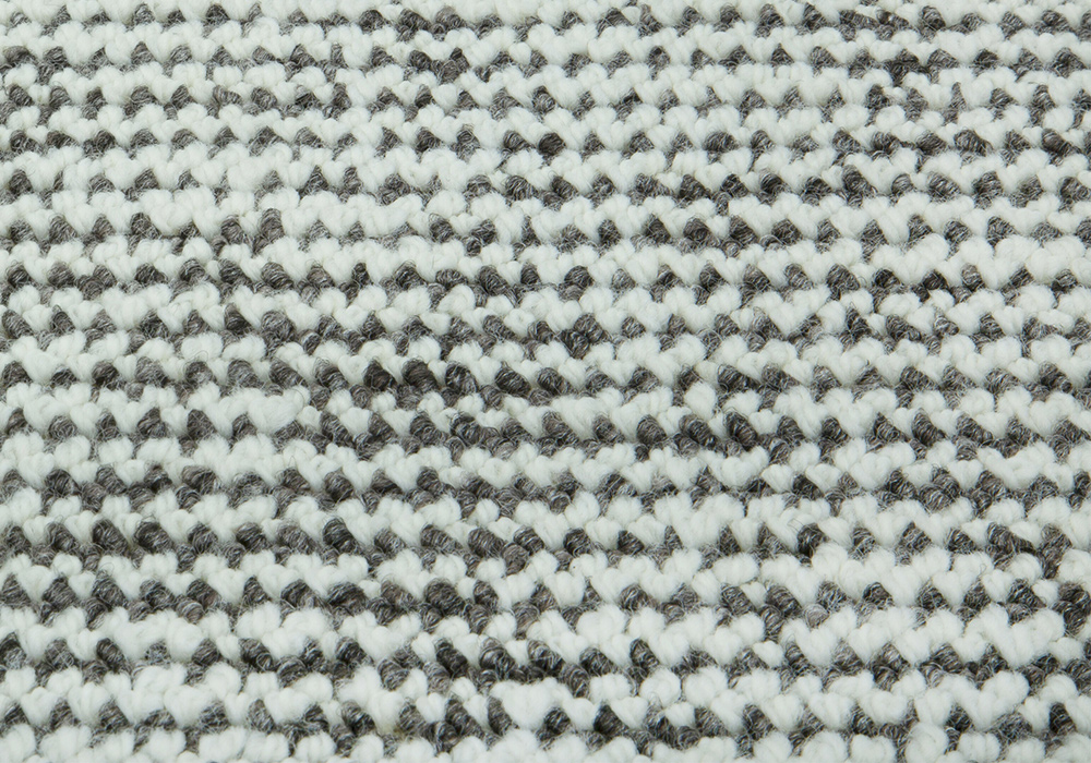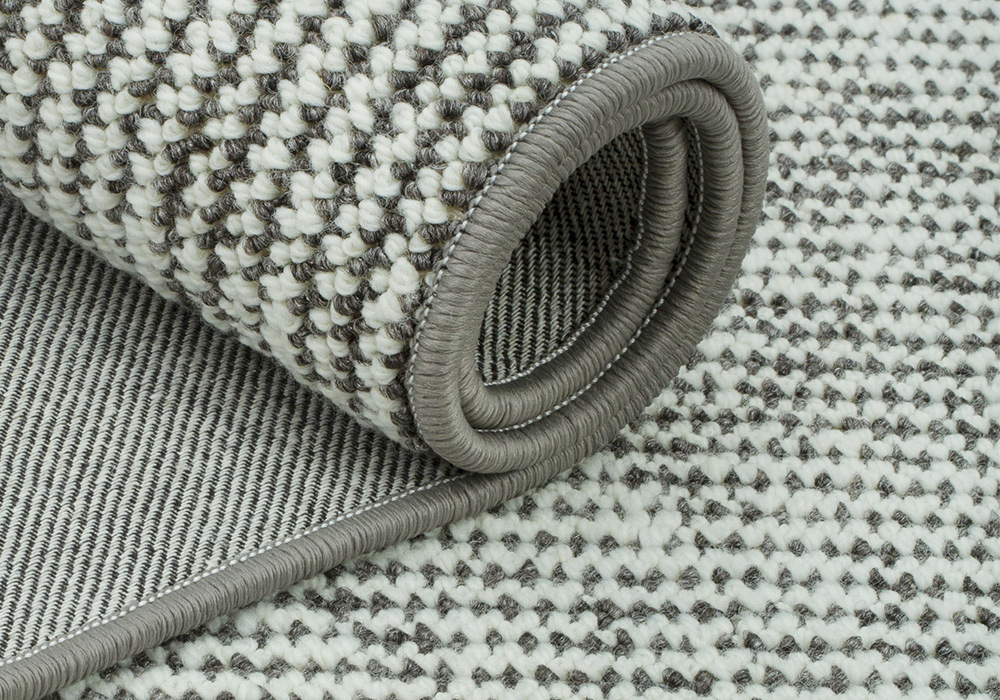 - Tấm thảm có họa tiết đan xen giữa các sợi trắng kem và xám, tạo hiệu ứng lưới nhỏ đều đặn.