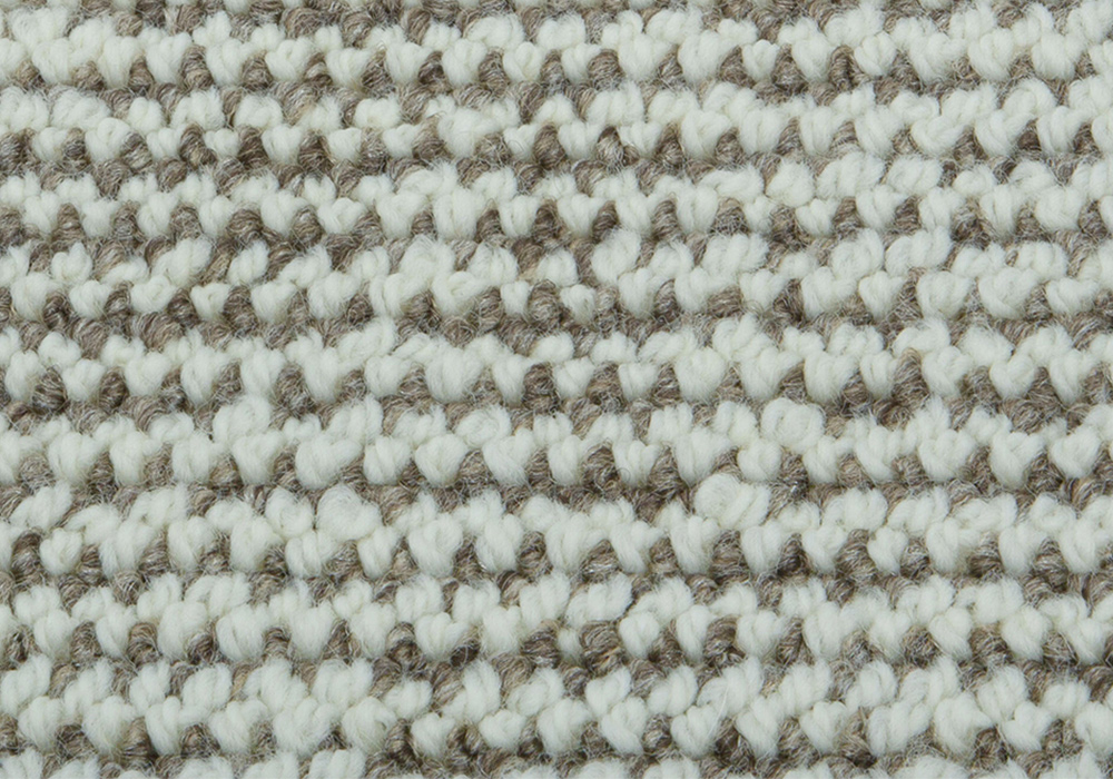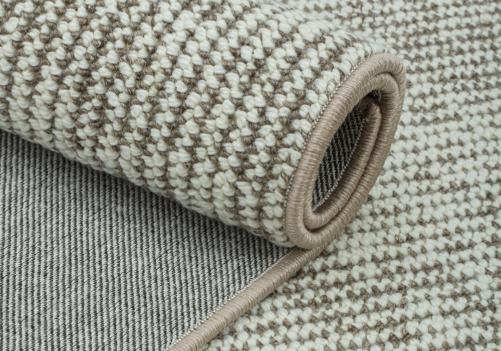 • Tấm thảm có họa tiết đan xen giữa các sợi trắng kem và xám, tạo hiệu ứng lưới nhỏ đều đặn.
