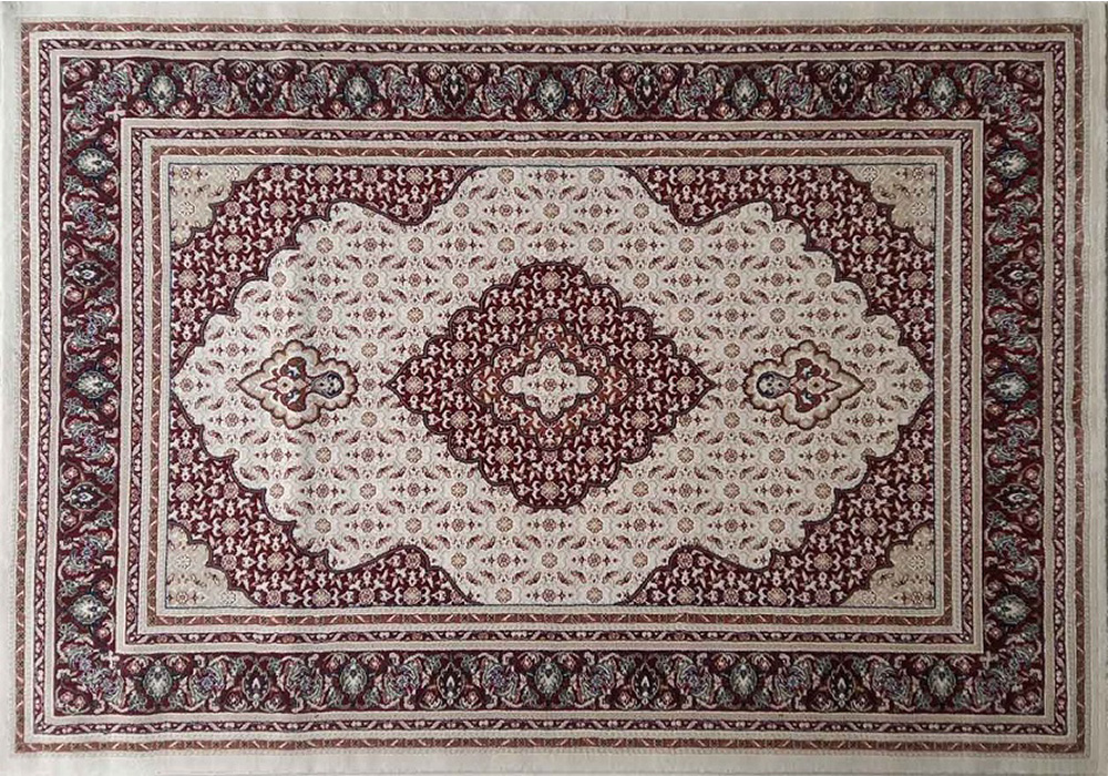 - Sự Đối Lập Tinh Tế Giữa Nền Kem Sáng Và Họa Tiết Đỏ Rượu Cầu Kỳ: Khu vực nền kem rộng lớn không chỉ mang lại cảm giác khoáng đạt mà còn làm nổi bật từng chi tiết hoa văn màu đỏ rượu và các sắc độ nâu sẫm được dệt công phu, tạo nên một bản hòa sắc thị giác ấn tượng.