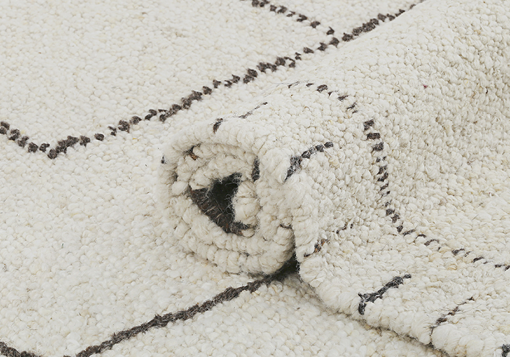 Màu sắc chủ đạo là tông trắng nhẹ nhàng, kết hợp với các đường nét đen nổi bật, tạo nên sự tương phản nhẹ nhàng nhưng không kém phần tinh tế. Sự kết hợp màu sắc này giúp tấm thảm dễ dàng hoà hợp với nhiều phong cách kiến trúc khác nhau, từ hiện đại đến tối giản.