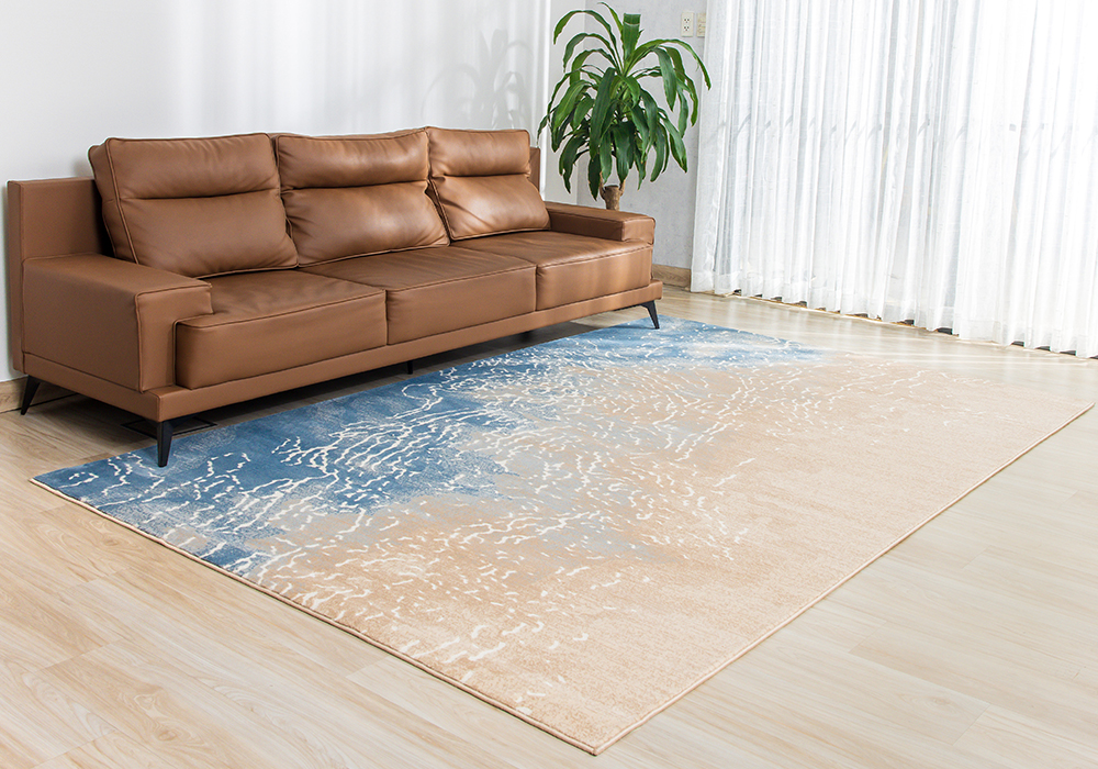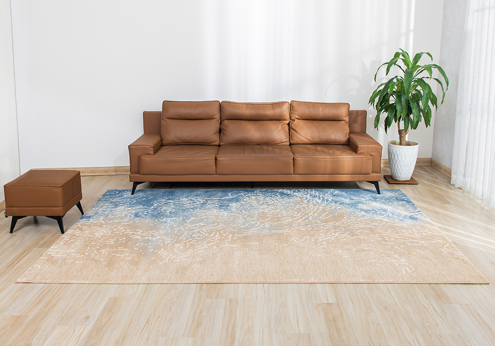 Tấm thảm HY310 sở hữu thiết kế trừu tượng, lấy cảm hứng từ những con sóng mềm mại lan tỏa trên bờ cát. Sự hòa quyện giữa gam màu be, xanh dương và trắng tạo nên vẻ đẹp thanh lịch, sang trọng và giàu tính nghệ thuật.