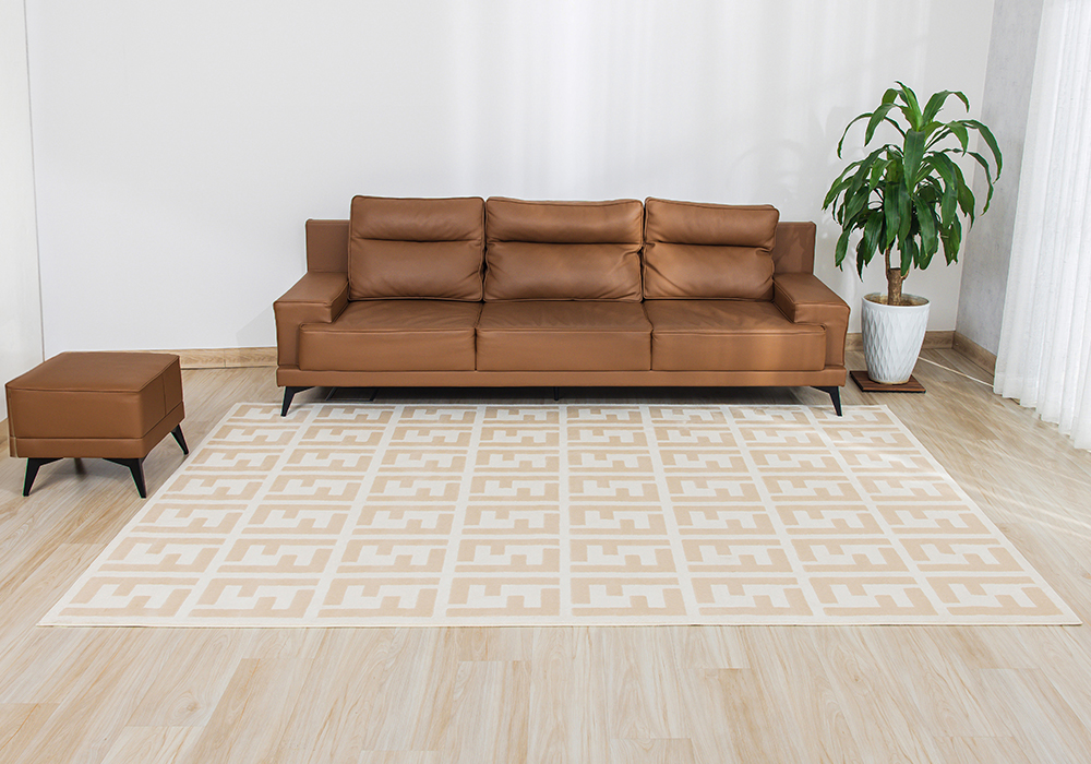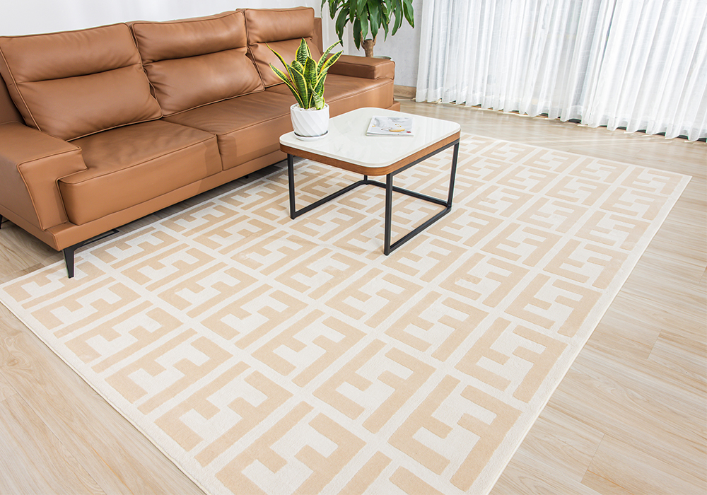 Tấm thảm HY510 gây ấn tượng với họa tiết hình học đối xứng hiện đại trên nền màu be trang nhã, mang lại vẻ đẹp tinh tế và dễ dàng hòa hợp với nhiều phong cách nội thất khác nhau, từ tối giản đến sang trọng.